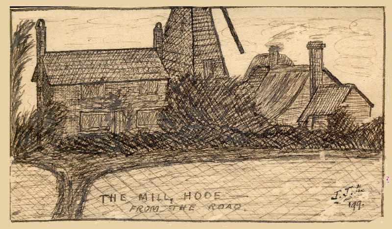 Simmons says that, this “mill stood on the east side of Hooe Common, a little to the south of Parish Farm, at the end of Mill Lane. It was owned by William Wrenn in 1806 and could have been built for him. Upon his death in 1810, the business was carried on by his widow and later sold to Thomas Baldock. It was subsequently acquired by William Walters of Ninfield who let it to Walter Wrenn in 1828. In 1833, it was bought by Walter Wrenn who worked it until 1841 after which it was worked by the Goldsmith family until pulled down in 1848. The smock mill was then built on the same site.”
