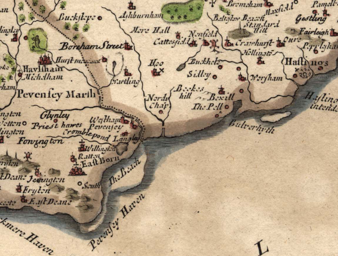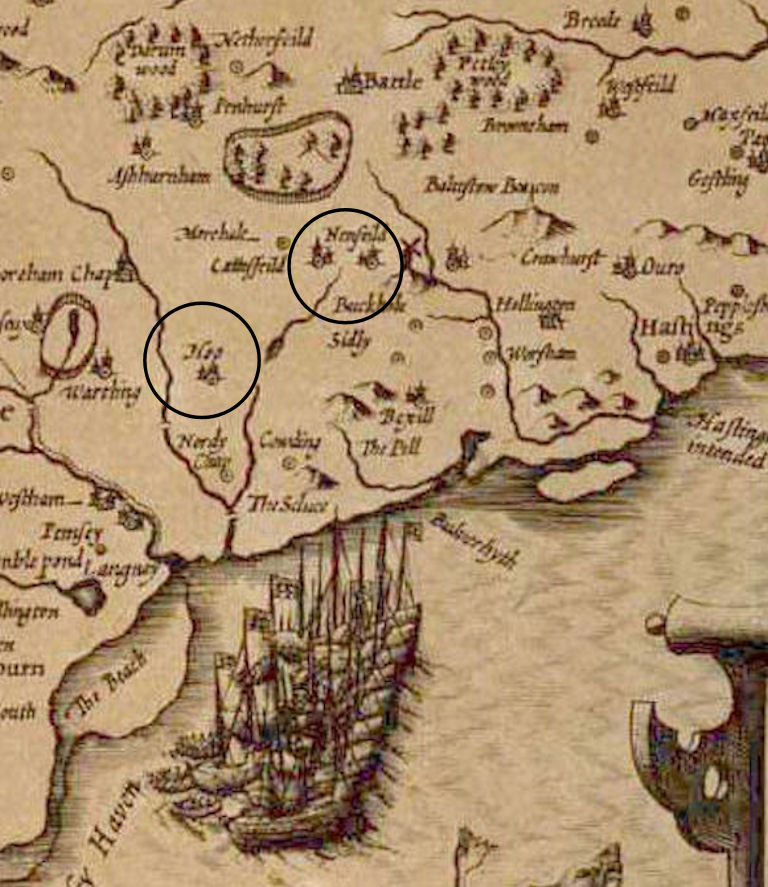 John Speed's map of 1610, shows a windmill that appears to be located much nearer to Ninfield than to Hooe, or even to Hooe Common (as does Robert Morden's map of 1695,and my immediate concern was that the mill shown might not have been that of Hooe but a windmill in Ninfield. The Domesday Book, however, doesn’t mention a windmill in Ninfield and none is shown on any later map, including the 1813 Ordnance Survey map of Sussex, which purported to show every windmill standing at that time. So, Ninfield’s windmill, pulled down in 1936, must have been built no earlier than 1814.