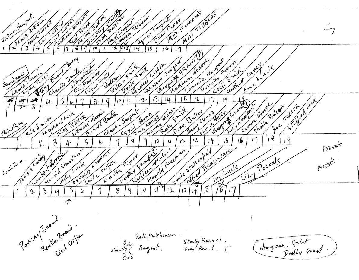With the photographs, there were several pieces of paper containing lists of pupils; one of these was not dated but the list almost fitted the positioning of the pupils in the above picture so I have assumed that it was my grandfather's intended plan as to which pupils would stand where, when being photographed. Of course, I can't be sure that anyone is in the right place, according to this plan, and there are certain problems; Marjorie Grant appears twice on the list and my grandmother, Mrs Newport, and Miss Tibballs, (Assistant Teacher), aren't, really, in the right row. There are seventeen children on the front row but only fourteen names on the list. However, on the bottom of the list, there are names of children that don't seem to have been allocated a position and these may be the missing children. Of course, the majority of the children may well be in their correct place and position; and the boys and girls, in each row do closely fit in with the list. The children identified as 'Newports' certainly, according to their facial features, do look to me to be correct to the plan. Also, we don't know who was ill and who didn't actually turn up on