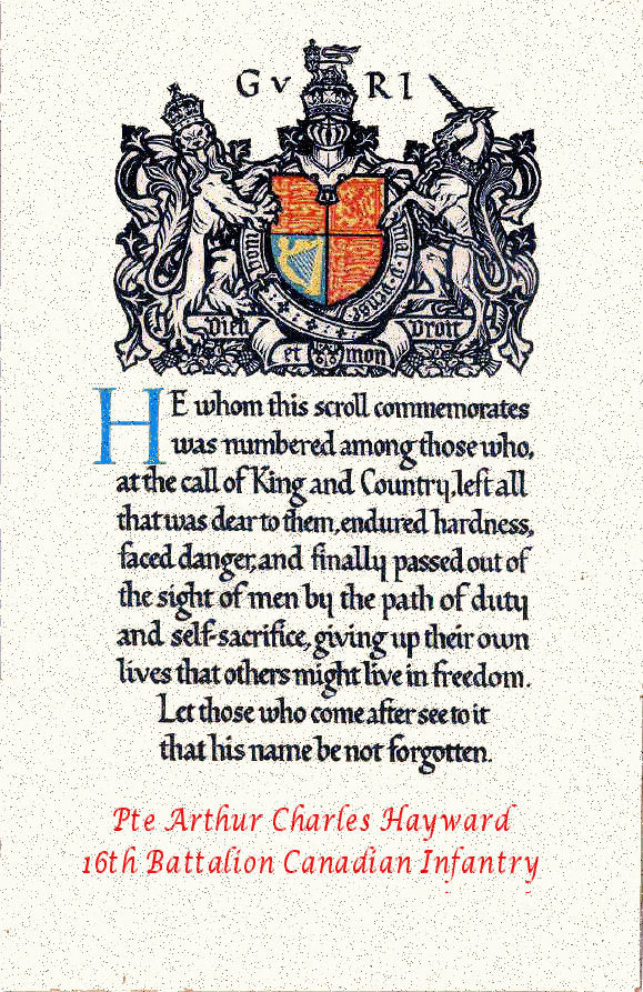 Memorial Plaque and Scroll - The next of kin of every soldier killed in action in WW1 was sent a memorial plaque together with a Scroll to acknowledge the service the man did for his country and the price he paid. Because I have not been able to find the plaque or the scroll for Thomas George Noakes, this link will take you to images of the plaque and scroll for Arthur Charles Hayward, who fought with the Canadian Infantry and died at the battle of St. Julien, in 1915.