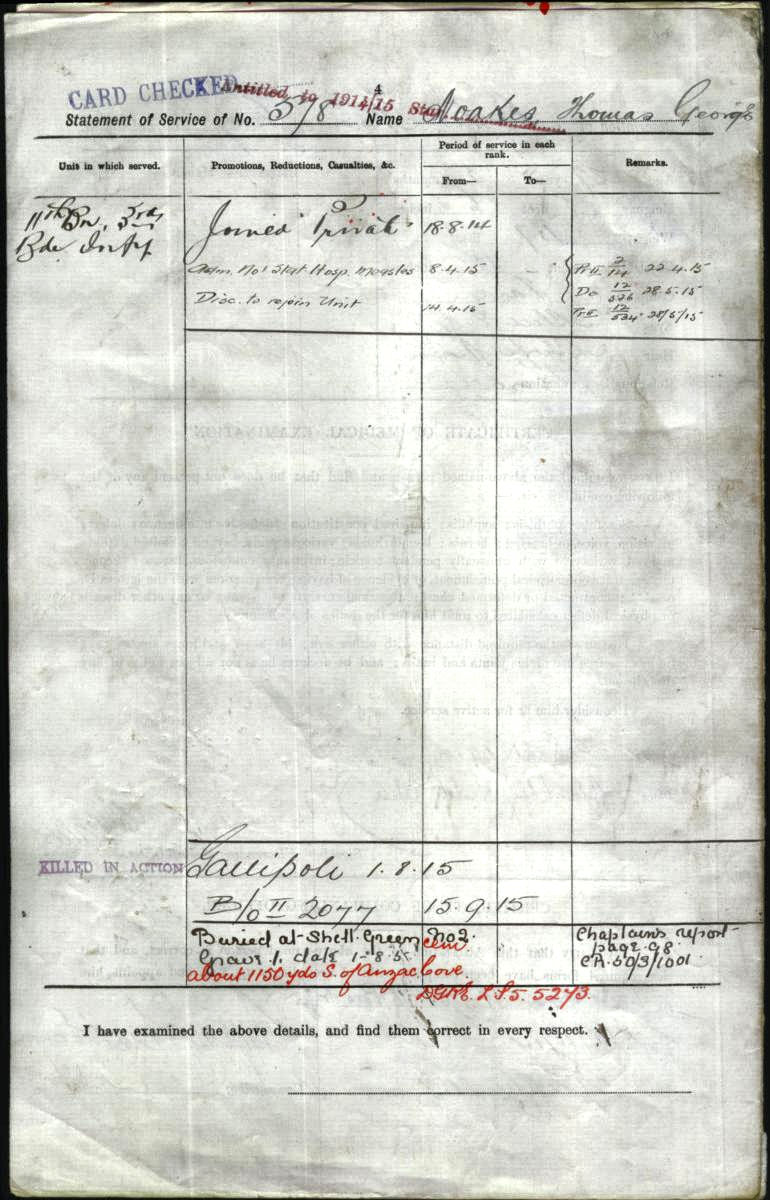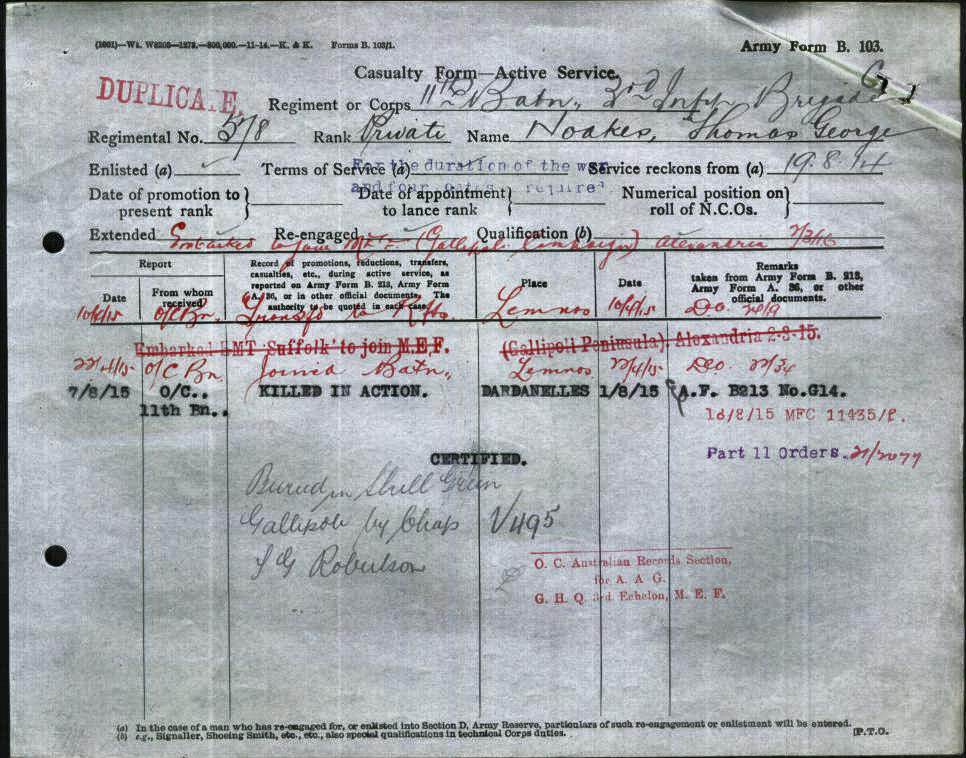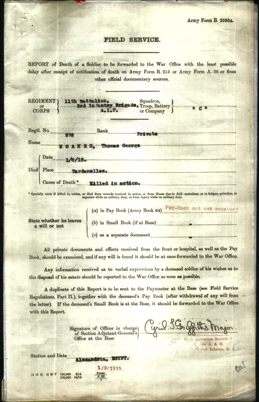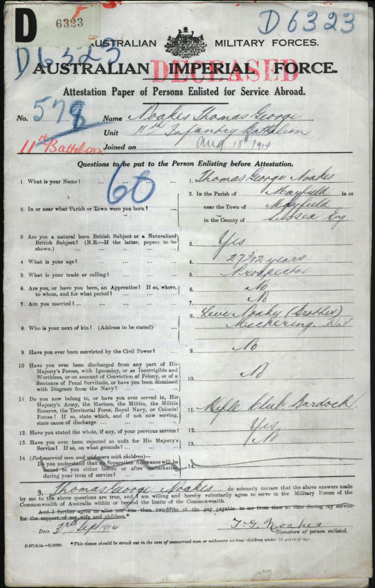 Unlike the British Archives, the National Archives of Australia has many records of their soldiers online, which are both free to view and to download. In the case of Thomas, there were a total of fifty-four separate images of documents and some, with the written permission of the NAA, I have included here. To see all the documentation on Thomas, click on this link National Archives of Australia: B2455 Noakes Thomas George