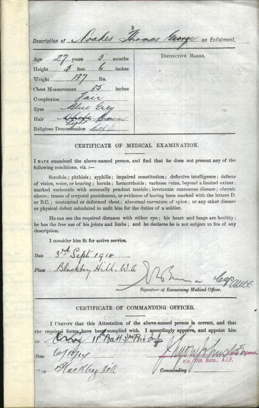 According to his "Attestation Papers", which he completed on 3rd September, he was 27 years and 5 months old, 5 feet 6 inches in height, weighed 137 lb., had a fair skin, light brown hair, and blue-grey eyes. He gave his next of kin as his brother, Levi, at Mechering, which was, and is, farming country, roughly 80 miles from Perth, in the west.