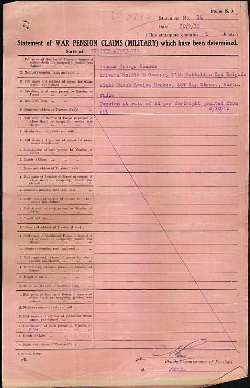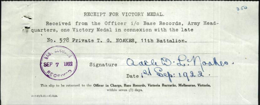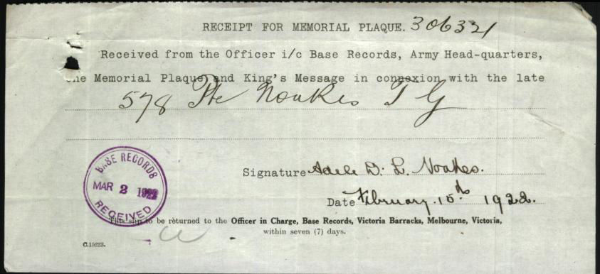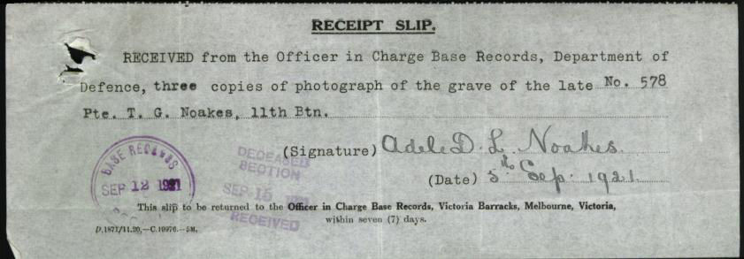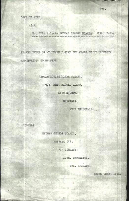 Sometime in 1914, but after Thomas had enlisted in the Infantry, he married an Adele Westcott, in Fremantle. We know this because on his original Attestation, he gave his next of kin as his brother Levi Noakes, but this was later amended to "Mrs. A.D.L. Noakes". Her Christian names were given as "Adele Dinah Louise" on one particular official form but, on his will, Thomas gives her full name and address as "Adele Louise Diana, c/o Mrs Harold Plant, King Street, Merredin, Western Australia". However, on a receipt slip sent to the Department of Defence in 1921, for some photographs she had received, she signed herself as "Adele D. L. Noakes" so there is some uncertainty as to her correct name. The "Adele", by the way, has an "accent acute" over the first "e", as per the French, but she writes it more like a "circumflex" and this has caused errors as it has been mistaken for the letter "i".